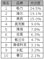 四、2014年4月空调品牌关注度TOP10