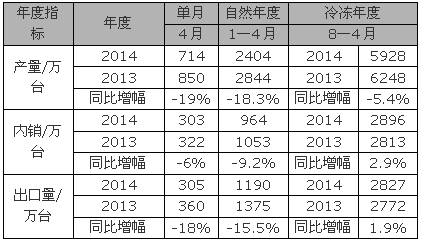 生产方面,4月行业产量水平环比有所提高,达到了714万台,但同比2013年排产量仍旧下降了19%。尽管对市场保持谨慎,厂商还是对旺季市场普遍给予了较大的期望。产能中的节能产品占比同比去年有大幅提升,在国家节能减排政策的大力推动下,变频产品的普及度越来越高,预期今年旺季变频销量占比将进一步扩大。