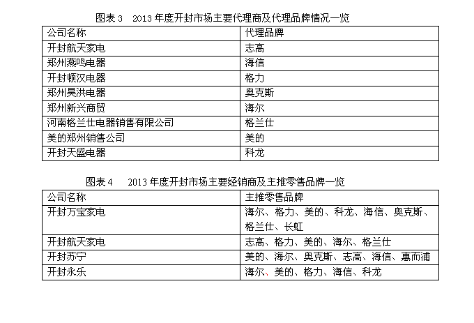 开封万宝家电共有6家门店。市区有3家门店、县城有3家门店,经营市场上大多数品牌。2013年度空调整体销售额为1.8亿元,其中变频机占比达65%。工程机同比进一步增长。开封航天家电除了代理志高在开封和郑州地区的销售以外,还零售格力、美的、海尔、格兰仕、志高。2013年度整体销售额同比进一步提升。永乐2005年11月进入开封市场,永乐在开封市场有1家门店。苏宁2010年6月进入开封地区,目前有2家门店,零售的品牌有美的、海尔、格力等。2014年,连锁进一步发起新的攻势,门店规模进一步扩大。据了解,除了国美增加了2家新门店,苏宁也新增加1家门店。