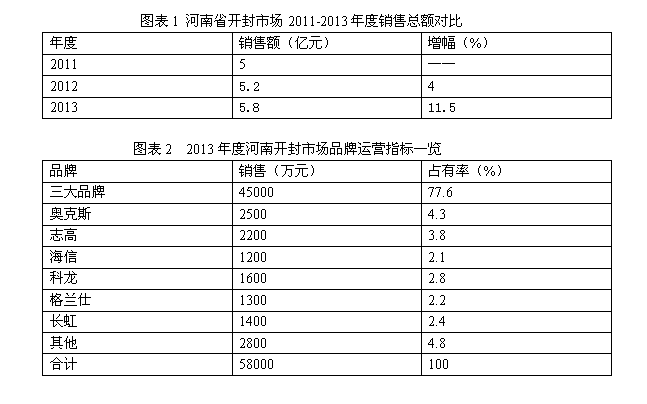 开封市场,本土零售卖场非常强势,占据着整体市场的大半江山,全国大连锁生存的压力很大。2013年,开封万宝家电和开封航天家电作为本土较大的零售商,同比销售额进一步提升。开封顿汉电器,开封天盛等是该区域本年度比较活跃的代理商。