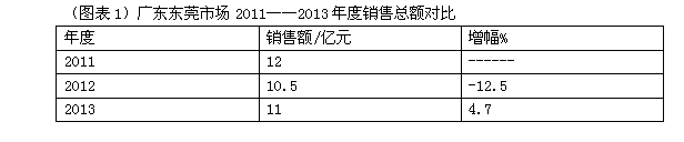 东莞为“广东四小虎”之一,号称“世界工厂”,是全国4个不设市辖区的地级市之一。位于珠江口东岸,东接惠州、南抵深圳、西挨广州、北达博罗县,四周共与广州、深圳和惠州的10个县级行政区接壤。同时是广州与香港之间水路交通的必经之路,1988年升格为地级市。全市面积2465平方公里,人口约800万左右,因有众多港澳同胞、海外华侨,因此还被称为“华侨之乡”。2013年度,广东东莞空调市场容量为11亿元,同比2012年度的10.5亿元增长4.7%(图表1)。虽然同比去年有所增长,但依旧复苏的相对缓慢,其主要原因归咎于本年度东莞地区连连受到灾害性的天气影响,所以给空调产业带来了负面影响。同时,虽然各品牌纷纷调整营销策略,逐步开始拓展市区以外的销售网点,但由于发掘时间较短,离市场整体爆发仍有一定距离。