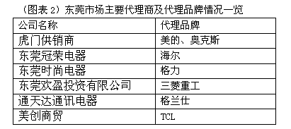 三菱重工在东莞主要采取代理加直供的销售模式,由东莞欢盈投资有限公司代理东莞区域。直营商主要为东莞苏宁电器等。(图表2)