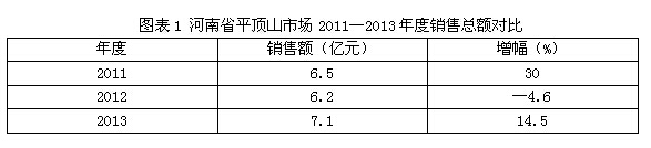 平顶山位于河南省中南部,管辖宝丰、郏县、鲁山、叶县四县,代管县级舞钢市。辖新华、卫东、湛河、石龙四个区,面积6301平方千米,总人口约390万。当地经济的快速发展大大拉动了空调市场的发展。尤其是三四级市场的人们生活水平的提高,消费意识的转变很大程度上助推了县、乡镇市场空调的销售。由于受整个大环境的影响,2012年度,平顶山整体市场容量约为6.2亿元,同比出现4.6%的下滑。本年度,空调市场呈现回暖趋势,尤其是旺季期间的高温,房地产市场刚性需求大大提升了整个年度的销售额(图1)。