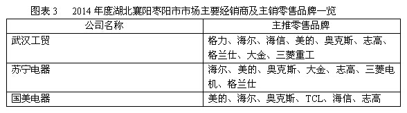 襄阳小白象主要负责代理襄阳地区的奥克斯,枣阳地区的销售额占其在整个襄阳市场份额的20%。苏宁在枣阳主要经营的品牌有海尔、美的、奥克斯、格兰仕、志高、海信科龙、长虹等。国美电器经营的品牌包括格力、海尔、奥克斯、志高等,另外,品牌专卖店在枣阳地区同样是有力的竞争者(图表3)。