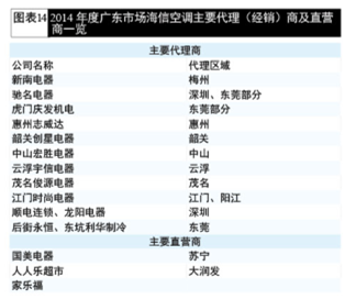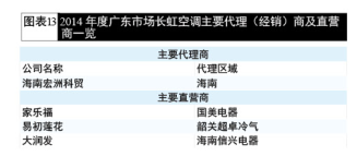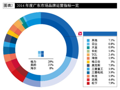 2014年度,广东市场大户代理商地位不可撼动的同时,小户经销商逐渐增多,品牌渠道进一步下沉。旺季期间,广东天气炎热,十分有利于空调销售。同时随着南方沿海城市整体经济的复苏,消费者购买力得到提升,也刺激了空调销售。渠道方面,随着一二级市场的逐渐饱和,但通过之前各企业对于三四级市场的开拓,本年度三四级市场销售情况十分出色,使广东市场渠道区域更加完整,空白区域几乎被开发完毕。