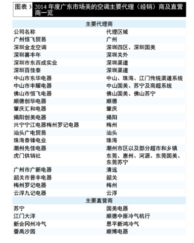 2014年度美的在广东通过广州、佛山、东莞、汕头4家分公司操作市场。采取代理加直营加专卖店加区域代理的销售模式。代理商方面,广州恒飞贸易取消代理美的商用空调而只负责家用空调,销售额为5000万元,深圳金龙空调代理深圳四区并供货深圳国美,深圳喜丰年代理深圳关外,深圳东西城实业、深圳百嘉泰代理深圳渠道,中山市东华电器代理中山、珠海、江门传统渠道系统,中山市丰耀电器供货中山国美、中山苏宁及商超系统,佛山市恒飞电器供货佛山国美、佛山苏宁,顺德创华电器代理顺德区域,肇庆汇和电器代理肇庆,揭阳创美电器代理揭阳区域,兴宁宁江电器、梅州罗记电器代理梅州地区,汕头广电贸易代理汕头区域供货汕头苏宁,珠海泰锋电业代理珠海区域,潮州先佳电器代理潮州市区以及部分超市和乡镇,虎门供销社代理东莞、惠州、河源区域供货东莞国美、东莞苏宁,广州市广新电器代理清远,韶关市晋丰电器代理韶关,云浮九记电器代理云浮。主要直营商是苏宁、国美电器、江门大洋、顺德中原冷气机行、新会冈州冷气、恩平新鸿冷气、顺博电器、深圳铭可达、番禹沙园等(图表3)。