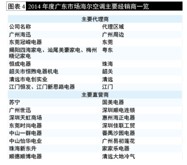 代理商方面,广州海迅代理广州周边区域,销售额为4000万元,东莞冠嵘电器代理东莞区域,销售额为1000万元。粤东区域代理商有揭阳四海家电、汕尾美豪家电、梅州晓记家电,恒成电器负责珠海区域,韶关市恒煦电器机电代理韶关,清远市电创实业代理清远区域,江门恒发、江门新思路电器代理江门区域。另外,值得一提的是天樽2代空调在广东市场十分受欢迎,为海尔整体增幅奠定了基础。主要直营商有番禺沙园电器,苏宁、国美电器、清远大地冷气、广州世迅、深圳顺电连锁、深圳天虹商场、惠州海正电器、东莞时尚电器、深圳佳联工贸、中山一群电器、中山怡华电业、广州易初莲花、珠海新东升、家家乐电器、顺德顺博电器等(图表4)。