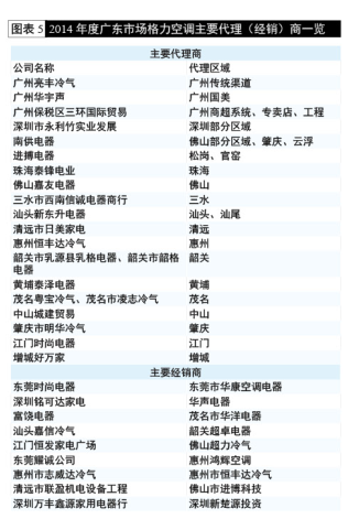 代理商方面,广州市亮丰冷气代理广州传统渠道,广州华宇声供货广州国美系统,广州保税区三环国际贸易供货广州商超系统、专卖店、工程,深圳市永利竹实业发展代理深圳部分区域,珠海泰锋电业代理珠海区域,佛山嘉友电器代理佛山区域,南供电器代理佛山部分、肇庆、云浮区域,销售额为6亿元。进博电器代理松岗、官窑区域,销售额为1亿元,汕头新东升电器代理汕头、汕尾地区,清远市日美家电代理清远区域,惠州恒丰达冷气代理惠州区域,韶关市乳源县乳格电器、韶关市韶格电器代理韶关区域,黄埔泰泽电器代理黄埔地区,茂名粤宝冷气和茂名市凌志冷气代理茂名区域,中山城建贸易代理中山区域,肇庆明华冷气代理肇庆区域,江门时尚电器代理江门区域,增城好万家代理增城区域。主要经销商有东莞时尚电器、东莞市华康空调电器、深圳铭可达家电、华声电器、富饶电器、茂名市华洋电器、汕头嘉信冷气、韶关超卓电器、江门恒发家电广场、佛山超力冷气、东莞耀诚公司、惠州鸿辉空调、惠州市志威达冷气、惠州市恒丰达冷气、清远市联盈机电设备工程、佛山市进博科技、深圳万丰鑫源家用电器行、深圳新楚源投资等(图表5)。