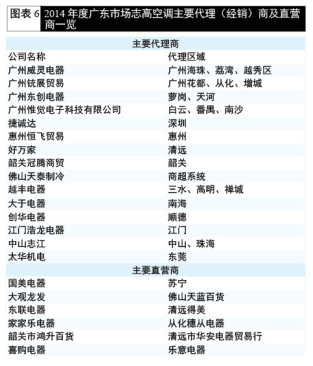 代理商方面,广州威灵电器代理广州海珠、荔湾、越秀区,广州铳展贸易代理广州花都、从化、增城区域,销售额为1800万元,广州东创电器有限公司代理萝岗、天河区域,广州惟觉电子科技有限公司代理白云和番禺、南沙区域,销售额为1200万元,韶关冠腾商贸代理韶关区域,大观龙发代理荔湾区域,捷诚达代理深圳区域,惠州恒飞贸易代理惠州区域,好万家代理清远区域,佛山天泰制冷代理商超系统,越丰电器代理禅城、高明、三水区域,大于电器代理南海,创华电器代理顺德区域,江门浩龙代理江门,中山志江代理中山、珠海区域,太华机电代理东莞区域,销售额为2000万元。直营商有大观龙发、国美电器、苏宁、东创电器、佛山天蓝百货、乐意电器、喜购电器等(图表6)。