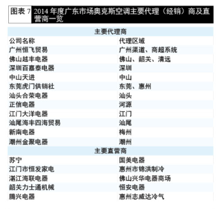 奥克斯2014年度在广东市场采取代理加直营的销售模式,通过广州、深圳、东莞3家营销中心操作市场,出货量为4亿元。广州营销中心管辖广州、清远、韶关、佛山、珠海、江门、中山、海南。深圳营销中心管辖深圳、惠州区域。东莞营销中心管辖东莞、汕头、梅州、揭阳、汕尾、潮州区域。