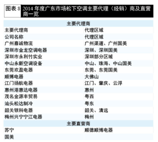 2014年度松下在广东的出货量为7.5亿元,采取代理加直营的销售模式。代理商方面,广州嘉诚物流代理广州渠道,供货广州国美,销售额为4亿元;深圳金龙空调电器代理深圳区域供货深圳国美;深圳市永利竹实业发展代理深圳部分区域,中山永新空调设备代理中山、珠海区域,同时供货中山国美,东莞欢盈电器代理东莞,供货东莞国美;顺博电器代理大佛山区域,销售额为2亿元;江门扬航电器代理江门、肇庆、云浮区域,销售额为1亿元;惠州港惠达电器代理惠州区域;茂名金源丰贸易有限公司代理粤西区域;汕头松达制冷代理粤东区域,韶关银科电器代理韶关、清远区域,梅州兴宁宁江电器代理梅州区域。直营商主要有苏宁、国美、顺德顺博电器等(图表8)。