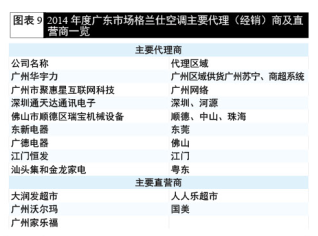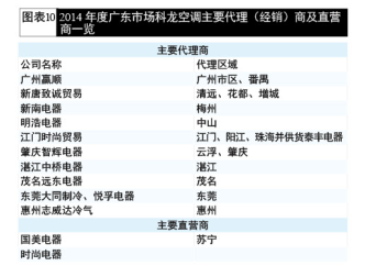 代理商方面,广州赢顺代理广州市区、番禺区域,新唐致诚贸易代理清远、花都、增城区域,新南电器代理梅州区域,明浩电器代理中山区域,江门时尚贸易代理江门、阳江、珠海区域并供货泰丰电器,肇庆智辉电器代理云浮、肇庆区域,湛江中桥电器代理湛江区域,茂名远东电器代理茂名区域,东莞大同制冷、悦孚电器代理东莞区域,其中悦孚电器销售额为1800万元,惠州志威达冷气代理惠州区域销售额为1000万元。直营商主要有国美电器、苏宁、时尚电器等(图表10)。