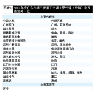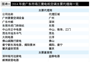 2014年度三菱电机在广东市场整体销售额为4亿元,采用大代理为主的销售模式。代理商方面,广州市晋菱空调设备代理广州区域,广东中顺代理深圳区域,东莞市虎门供销社代理东莞区域,中山市正中电器代理中山、珠海、江门,茂名市远东冷气有限公司代理茂名区域,大利电器代理云浮,佛山市诚隆行家电代理佛山区域,揭阳景洲和普宁新东海电器有限公司共同代理揭阳、普宁区域,肇庆盛世贸易代理肇庆区域。直营商主要有深圳铭可达家电、顺博家居电器、益群电器(图表11)。