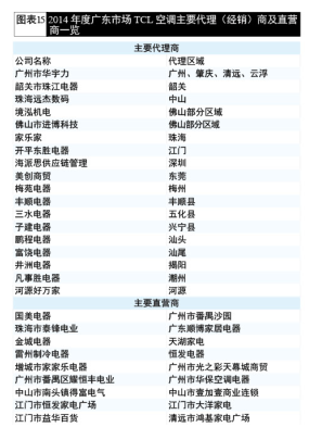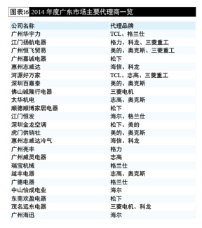 代理商方面,广州市华宇力代理广州、肇庆、清远、云浮区域,销售额为1400万元,韶关市珠江电器代理韶关区域,珠海远杰数码代理中山区域,销售额为2500万元,境泓机电代理佛山区域,佛山市进博科技代理佛山部分区域,家乐家代理珠海区域,开平东胜电器代理江门区域,海派思供应链管理代理深圳区域,美创商贸代理东莞区域,梅苑电器代理梅州,丰顺电器代理丰顺县,三水电器代理五化县,子建电器代理兴宁县,鹏程电器代理汕头,富饶电器代理汕尾,井洲电器代理揭阳,凡事胜电器代理潮州,河源好万家代理河源区域。直营商主要有国美电器、广州市番禺沙园电器、江门大洋电器、天湖家电等(图表15)。