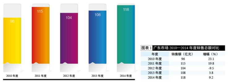 广东市场作为美的、格兰仕、TCL等众多知名空调品牌的大本营,本身拥有着坚实的地域优势。与全国其他市场不同,2014年度,广东空调市场总体增长较快,尤其进入旺季后天气十分有利于空调销售,空调市场开始井喷。广东市场总容量为118亿元,较上一年度108亿元,同比增幅为9.2%(图表1)。各品牌针对当地市场加强调整销售渠道和产品线,并推出各种促销活动,极大的刺激了消费者对于空调需求的欲望等。