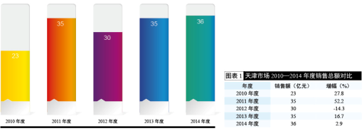 2014年度,天津市场的连锁卖场同比都有不同程度的增幅,2014年度由于天津市场天气较为理想,所以对各渠道销售成绩都产生积极的拉动作用。