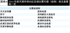 2014年度,长虹在天津地区的连锁卖场由长虹北京产管中心负责,销售额为4000万元,长虹河北分公司则负责天津地区的传统渠道。本年度,国美电器表现较好。主要经销商有天元宝商厦,销售额为500万元,国美电器、苏宁、滨海新区大港宏丹、静海国美电器、津南富贵发家电、廊坊灿坤商贸、武清林泉家电、武清区源武家用电器、廊坊华龙电器、天津宇静电器、永清永发家电等(图表10)。