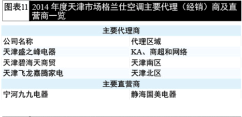 格兰仕空调天津营销中心负责天津地区的销售,采取代理加直营的销售模式,2014年度销售额为1.2亿元。主要代理商有天津盛之峰电器销售有限公司、天津碧海天商贸有限公司、天津飞龙嘉腾家电,天津盛之峰电器主要负责KA、商超和网络渠道,销售额为4500万元左右,天津碧海天商贸有限公司代理天津南区销售,天津飞龙嘉腾家电负责北区销售,在电商平台的销售额达到1亿元。主要直营商有宁河九九家电、静海国美电器等(图表11)。