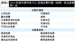 2014年度,TCL天津分公司主要负责天津、唐山、秦皇岛、沧州等区域,采取区域代理加直营的销售模式,销售额为8000万元。代理商方面,冀东商厦代理津南地区,天津聚泰鸿丰电器和天津六联昌商贸代理天津市区,宁河红会电器代理宁河县。主要直营商有国美电器、蓟县嘉乐电器、天津庆丰伟业、宝坻中联电器、塘沽金元宝商场、静海国美电器等,其中国美电器表现最为突出(图表12)。