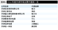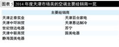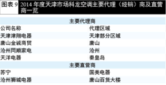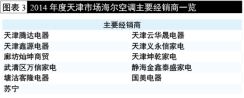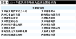 2014年度,天津海尔工贸操作天津市场,采取专卖店加直营的销售模式,本年度海尔依旧占据较大的市场份额,其最新空调产品受到消费者的青睐。海尔在天津的主要经销商有天津腾达电器、天津云华晟电器、天津鑫源电器、天津义永信家电、廊坊灿坤商贸、天津坤乾家电、武清区万信家电、静海金鑫泰盛家电、塘沽客隆电器、国美电器、苏宁(图表3)。