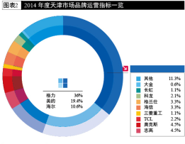 2014年度,天津市场总体销售额为36亿元,较2013年度增长2.9%(图表1)。2014年度天津市场在上半年由于天气因素利好,从而空调销售呈现优良表现,进入下半年,因零售端房地产政策的管控,加之天气因素,使得市场扩容受阻,天津市场在2014年度空调销售趋势相对平稳。