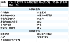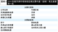 海信科龙天津分公司管辖天津市场,同时还负责河北唐山、沧州、承德、秦皇岛地区的销售,采取代理加直营的销售模式,2014年度的销售额为1.2亿元。代理商方面,天津鑫雅凯电器代理天津地区,沧州海洋电器代理沧州地区,承德亿东商贸代理承德地区。主要直营商有苏宁、国美电器、天津金元宝商厦、唐山百货大楼、唐山家万佳超市、沧州阳光三联大厦、沧州狮城电器等(图表8)。