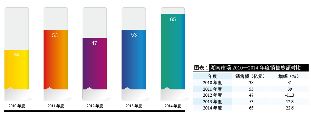 2012年度、2013年度湖南空调市场容量分别为47亿元、53亿元。2014年度总体销售额为65亿元,同比增长22.6%(图表1)。