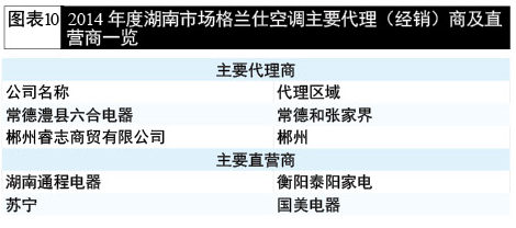 本年度格兰仕湖南营销中心操作整个市场,以代理为主。新年度格兰仕在湖南市场将实现全面布局,加强与地标店的合作,进一步完善渠道合作。主要代理商为常德澧县六合电器代理常德和张家界,郴州睿志商贸有限公司代理郴州地区。主要直营商为苏宁、国美电器、湖南通程电器、衡阳泰阳家电(图表10)。