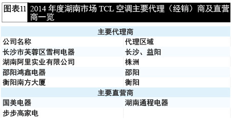 本年度TCL由长沙营销中心负责全省。衡阳、郴州、株洲、益阳等区域市场有着较好的表现。主要代理商有长沙市芙蓉区雪柯电器代理长沙、益阳,湖南阿里实业有限公司代理株洲地区,邵阳鸿鑫电器代理邵阳,衡阳南方大厦代理衡阳地区。主要直营商为国美电器、湖南通程电器、步步高家电(图表11)。