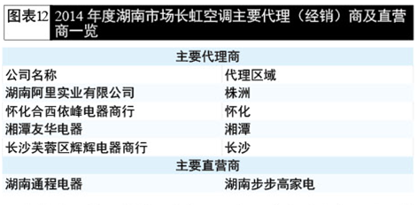本年度长虹空调由湖南产管中心管辖全省,主要采取代理加直营的模式。株洲、怀化、湘潭、长沙等地区取得了较大的增幅。主要代理商有湖南阿里实业有限公司代理株洲,怀化合西依峰电器商行代理怀化,湘潭友华电器代理湘潭,长沙芙蓉区辉辉电器商行代理长沙。主要直营商有湖南通程电器、湖南步步高家电(图表12)。