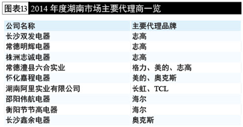 衡阳节节高电器代理海尔衡阳部分区域,邵阳伟航家电代理海尔邵阳部分区域,长沙鑫余电器代理奥克斯长沙、益阳地区(图表13)。