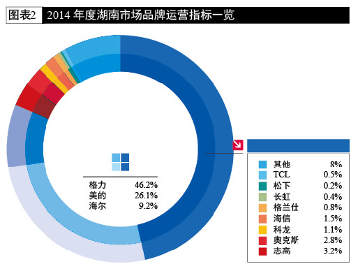 湖南市场中,一二级市场增速放缓,三四级市场在各品牌的精耕细作下,呈现出良好发展势头。渠道网络归口,得到完善和进一步优化。长沙双发电器、常德澧县六合实业、衡阳节节高电器、常德明辉电器、怀化嘉程电器等都是本年度表现较好的代理商。