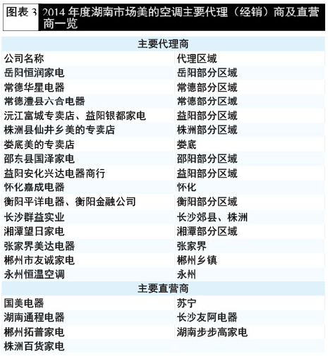 美的在湖南市场由美的制冷产品销售公司来整体操作。经营模式为代理加直营。本年度主要代理商岳阳恒润家电代理岳阳部分区域,常德华星电器代理常德部分区域,常德澧县六合电器代理常德部分区域,沅江富城专卖店、益阳银都家电代理益阳部分区域,株洲县仙井乡美的专卖店代理株洲部分区域,娄底美的专卖店代理娄底,邵东县国泽家电代理邵阳部分区域,益阳安化兴达电器商行代理益阳部分区域,怀化嘉成电器代理怀化,衡阳平详电器、衡阳金融公司代理衡阳部分区域,长沙群益实业代理长沙郊县、株洲,湘潭望日家电代理湘潭部分区域,张家界美达电器代理张家界,郴州市友诚家电代理郴州乡镇,永州恒温空调代理永州。