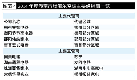海尔在湖南市场由海尔长沙工贸整体操作,经营模式是直营加小代理。本年度主要代理商郴州睿智电器代理郴州部分区域,衡阳节节高电器代理衡阳部分区域,邵阳伟航家电代理邵阳部分区域,吉首宏发电器代理吉首部分区域,