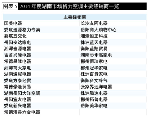 格力在湖南市场由湖南盛世欣兴格力贸易有限公司操作整个市场,采取直营大户加专卖店的操作模式。2014年度主要经销商有国美电器、长沙友阿电器、娄底涟源格力专卖、岳阳商大购物中心、娄底五交化、湘潭恒正科技、岳阳安达家电、株洲蓝天电器、湘潭宏源电器、衡阳蓝翔贸易、吉首兴隆电器、湖南步步高家电、常德昌隆电器、郴州恒瑞家电、湘潭商大家电、郴州冠华家电、湖南通程电器、娄底方泰经贸、株洲百货家电、常德豪隆贸易、衡阳科文冷气、湖南岳阳大洋空调、张家界远洋电器、岳阳宜友电器、株洲腾达电器、娄底新兴电器、郴州拓普电器、岳阳美华家电等、常德澧县六合电器(图表5)。
