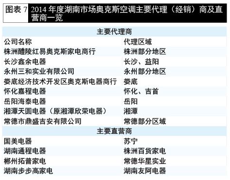 本年度奥克斯长沙营销中心操作整个湖南市场,采取代理加直营的经营模式。主要代理商株洲醴陵红易奥克斯家电商行代理株洲部分地区,长沙鑫余电器代理长沙、益阳,永州三和实业有限公司代理永州部分地区,娄底经济技术开发区奥克斯电器商行代理娄底,怀化嘉程电器代理怀化、吉首,岳阳海泰电器代理岳阳,湘潭天圆电器(原湘潭欣荣电器)代理湘潭,常德市鼎盛吉安有限公司代理常德部分区域。