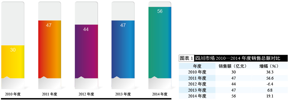 2014年度四川空调市场总容量为56亿元,同比上涨19.1%(图表1)。