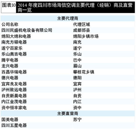 海信空调泸州分公司管辖范围内,宜宾良友电器代理宜宾,泸州致远电器代理泸州,自贡新晨电器代理自贡,内江金茂电器代理内江,资中恒丰家电代理资中。国美电器、苏宁由分公司直接操作(图表10)。