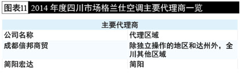 格兰仕空调四川营销中心2014年度渠道销售额为8800万元,天猫、京东等线上销售也不错。电商销量增长迅猛是本年度格兰仕空调在四川市场最大的亮点。格兰仕空调在四川区域的网络较为完善,基本实现了一县一点,销售网络基本布局到了乡镇市场(图表11)。