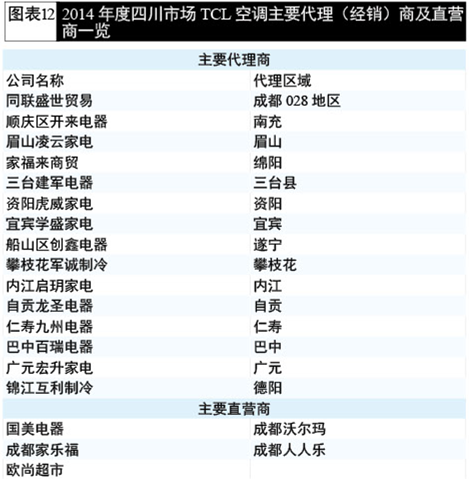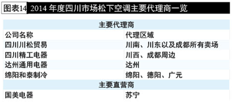 松下空调四川办事处管辖整个四川地区。四川川松贸易有限公司(松下和成百贸易有限公司合资组建)负责川南、川东以及成都的百货店,四川精工电器代理川西、成都周边地区,达州通用电器代理达州,绵阳和泰制冷代理绵阳、德阳、广元。直营商为国美、苏宁(图表14)。