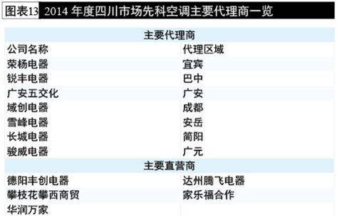 先科空调四川产品管理中心管辖整个四川地区,采用代理加直营的经营模式。荣杨电器代理宜宾,锐丰电器代理巴中,广安五交化代理广安,域创电器代理成都,雪峰电器代理安岳,长城电器代理简阳,骏威电器代理广元。主要直营商有德阳丰创电器、达州腾飞电器、攀枝花攀西商贸。在成都、宜宾、南充地区与家乐福合作,共进驻了家乐福15个店,与华润万家合作,共进驻了6个店(图表13)。