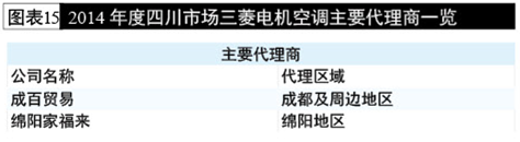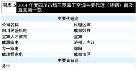 三菱重工空调成都事务所管辖除达州外的全川,四川民盛机电代理成都郊县,宜宾人才商贸代理宜宾。成源家电代理泸州、内江,龙一家电代理绵阳,成瑞祥家电代理成都市区。三菱重工在四川区域还有其他代理商(图表16)。