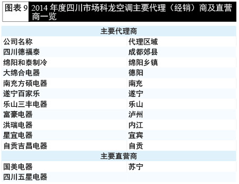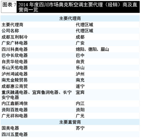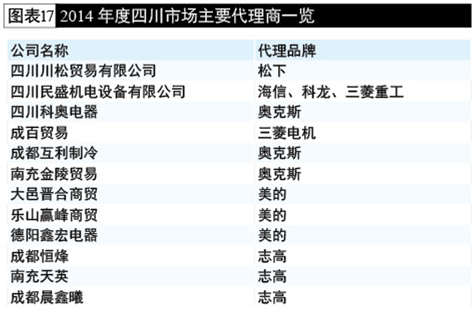 四川民盛机电设备有限公司代理海信、科龙、三菱重工空调成都郊县地区。四川川松贸易代理松下空调川南、川东以及成都的百货店。成百贸易(四川菱通电器有限公司)代理三菱电机空调成都及周边地区。成都互利制冷代理奥克斯空调成都市区,南充金陵贸易代理奥克斯空调南充地区,四川科奥电器代理奥克斯空调绵阳、德阳、眉山地区。大邑晋合商贸代理美的空调大邑、成都、温江地区,德阳鑫宏电器代理美的空调德阳地区,乐山赢峰商贸代理美的空调乐山地区。成都恒烽代理志高空调028 地区,南充天英家电代理志高空调广元、南充地区,成都晨鑫曦代理志高空调资阳、内江地区(图表17)。