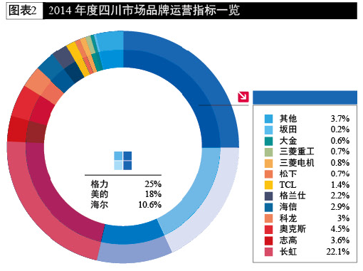 四川市场上格力、美的、海尔、长虹非常强势,在市场上的网点也很密集,占领了绝大部分市场份额。志高、奥克斯、格兰仕表现活跃,斩获颇丰。相对国产品牌,外资品牌较为弱势,仅三菱电机和松下表现比较突出(图表2)。
