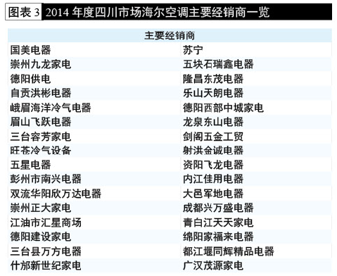 海尔在四川的主要经销商有国美电器、苏宁、五星电器、广汉茂源家电、彭州市南兴电器、绵阳家福来电器、大邑军地电器、崇州九龙家电、什邡新世纪家电、德阳西部中城家电、旺苍冷气设备、三台县万方电器、都江堰同辉精品电器、五块石瑞鑫电器、剑阁五金工贸、资阳飞龙电器、内江佳用电器、成都兴万盛电器、青白江天天家电、德阳供电、峨眉海洋冷气电器、江油市汇星商场、隆昌东茂电器、龙泉东山电器、射洪金诚电器、崇州正大家电、乐山天朗电器、三台容芳家电、德阳建设家电、眉山飞跃电器、自贡洪彬电器、双流华阳欣万达电器等(图表3)。