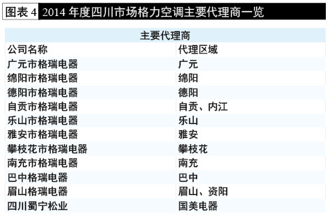 四川盛世欣兴格力贸易有限公司管辖除沪州、宜宾、遂宁、达川、广安外的所有四川地区和西藏。在四川市场以区域代理为主,在二级市场和当地经销商合资组建成销售公司管辖当地市场。自贡市格瑞电器销售有限公司管辖自贡和内江地区;广元市格瑞电器销售有限责任公司管辖广元地区;乐山市格瑞电器管辖乐山地区;眉山格瑞电器代理眉山、资阳地区;雅安市格瑞电器销售有限公司管辖雅安地区;攀枝花市格瑞电器管辖攀枝花地区。绵阳市格瑞电器管辖绵阳地区;德阳市格瑞电器管辖德阳地区;南充格瑞电器代理南充地区,巴中格瑞电器代理巴中地区。四川蜀宁松业供货国美电器。