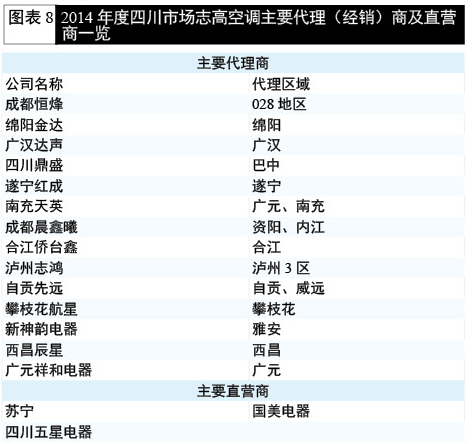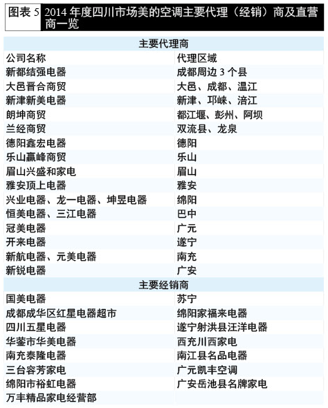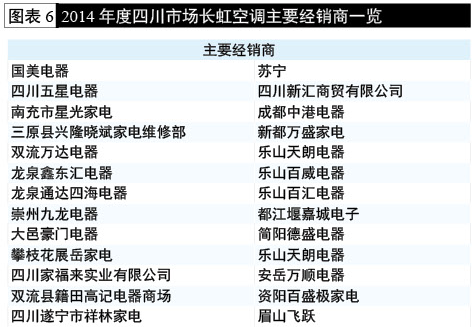 主要经销商有国美电器、四川五星电器、苏宁、成华区红星电器超市、绵阳家福来电器、万丰精品家电经营部、遂宁射洪县汪洋电器、华蓥市华美电器、西充川西家电、南充泰隆电器、南江县名品电器、绵阳市裕虹电器、三台容芳家电、广元凯丰空调、广安岳池县名牌家电等(图表5)。