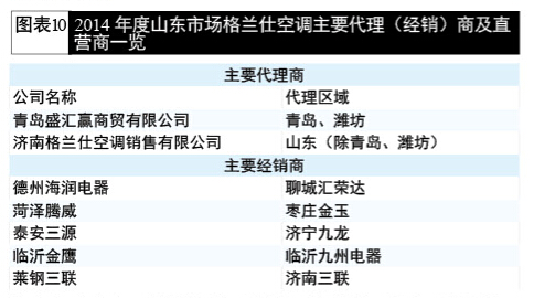 代理商方面,青岛盛汇赢商贸有限公司代理青岛和潍坊,其余区域由济南格兰仕空调销售有限公司代理。主要经销商有德州海润电器、聊城汇荣达、菏泽腾威、枣庄金玉、泰安三源、济宁九龙、临沂金鹰、临沂九州电器、莱钢三联、济南三联等(图表10)。