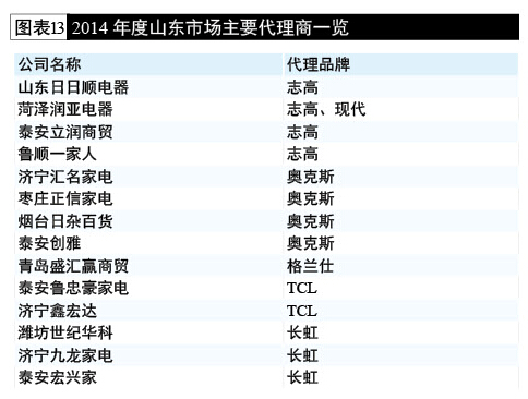 山东日日顺代理志高空调日日顺连锁的业务,菏泽润亚电器代理志高、现代空调菏泽地区,泰安立润商贸代理志高空调泰安、莱芜地区,鲁顺一家人代理志高空调济南地区;济宁汇名家电代理奥克斯空调济宁、菏泽地区,枣庄正信家电代理奥克斯空调枣庄地区,烟台日杂百货代理奥克斯空调烟台地区,泰安创雅代理奥克斯空调泰安地区;青岛盛汇赢商贸代理格兰仕空调青岛和潍坊地区;济宁鑫宏达代理TCL空调济宁地区,泰安鲁忠豪家电代理TCL空调泰安、莱芜地区;潍坊世纪华科代理长虹空调潍坊地区,济宁九龙家电代理长虹空调济宁地区,泰安宏兴家代理长虹空调泰安、莱芜地区(图表13)。