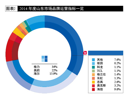 作为本土品牌,海尔、海信在山东市场上的优势一直十分明显。随着格力、美的的强势崛起,山东空调市场上的品牌更为集中,留给其他品牌的空间很小。与其他地区相比,山东市场有个突出的特点,就是全国家电连锁比较弱势,本土零售商家占据了绝大部分市场。由于采用直营或者小代理模式的厂家众多,山东市场上大型的空调代理商不多,只有志高和奥克斯的代理商相对具有优势(图表2)。